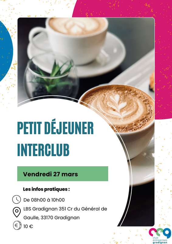 Nous vous donnons rendez-vous pour un petit-déjeuner inter-club au LBS à Gradignan. Un moment privilégié pour rencontrer les membres des clubs voisins, échanger, créer de nouvelles opportunités et développer votre réseau dans une ambiance conviviale et dynamique.Venez petit-déjeuner, réseauter et multiplier les connexions dans un cadre propice aux échanges professionnels.