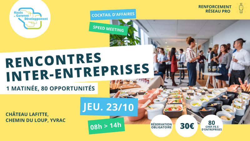 Rencontres Inter-EntreprisesJeudi 23 octobre 2025 : 08h - 14hChefs d'entreprise, ne dépassent pas l'occasion de rencontrer et convaincre 80 dirigeants en une matinée. Rendez-vous le 23...